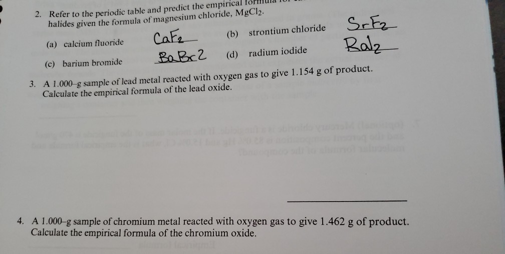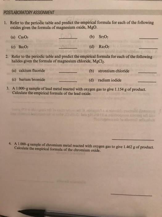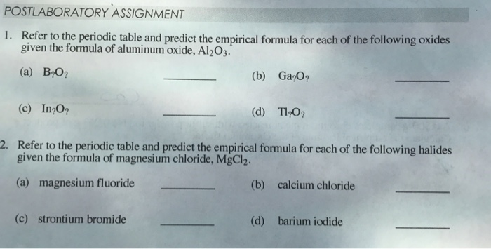 Solved Postlaboratory Assignment Refer To The Periodic Table And Predict The Empirical Formula For Each Of The Following Oxides Given The Formula Of Magnesium Oxide Mgo A Cano B Srzo Ba O Ra O Refer